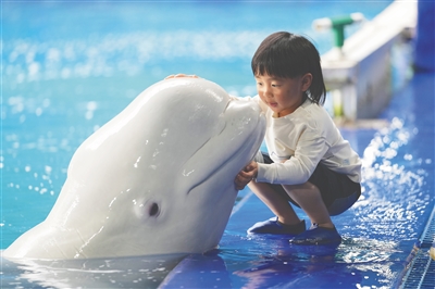 2024年12月31日,在三亚·亚特兰蒂斯水族馆,游客正在与白鲸互动。