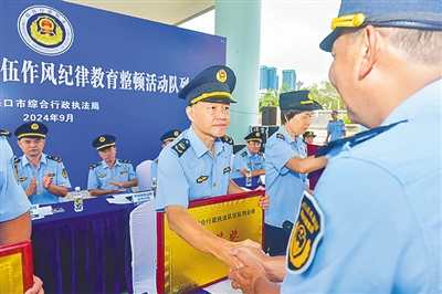 为持续正风肃纪,营造风清气正的政治生态,海口市综合行政执法局深入开展综合行政执法队伍作风纪律教育整顿,整治执法队伍中存在的作风懈怠、不敢担当、自由散漫、随意处罚、吃拿卡要等侵害群众利益问题。经过两轮教育整顿活动,处分处理960人。制定《进一步加强综合行政执法队伍建设若干措施》,形成开展常态化思想政治教育、开展常态化业务培训、开展常态化练兵比武、开展常态化督察、开展常态化问题查纠、开展常态化监督执纪的“六个常态化”措施,有效推动常态化开展执法队伍作风纪律教育整顿。