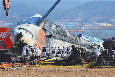 图为2024年12月31日,工作人员在韩国务安飞机失事现场进行调查工作。新华社/法新