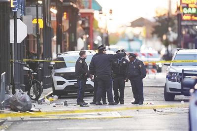 应急人员在发生汽车冲撞人群事件的美国新奥尔良市波旁街调查。 新华社/美联