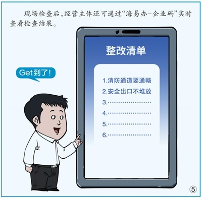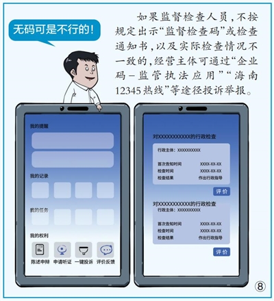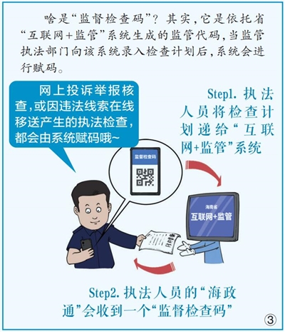 注解2025年1月1日起,海南省各级监管执法部门开展涉企现场监督检查时,将通过“海政通”主动出示“监督检查码”,经营主体可通过“海易办”、微信等扫码知悉检查的内容、依据、人员等信息,查询检查结果,让监管执法更透明、更规范。