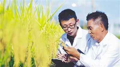 海南农商银行客户经理(左)实地查看水稻生长情况。
