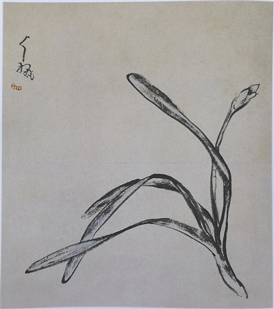 清代画家八大山人喜欢将水仙作为绘画题材,但八大山人画水仙,却与众不同,独辟蹊径,表现于他画水仙时,喜欢画一枝水仙,画面上往往画几片叶子,一枝花梗从叶片中钻出来,呈现出构图和用笔均极简疏,可谓“笔简形具”,自然入妙,给人以“窥一枝而得芳华无限”的视觉艺术享受。如其一幅《水仙图》,一枝水仙,叶片寥寥数枚,但所画的叶片柔软有力度,向背虚实相当精妙;画面看起来没有风像有风,以至于叶片不动却像动一样,别开生面。花枝从叶片间探出,平中出奇,妙不可言。