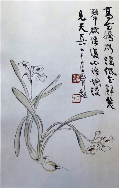 近现代画家齐白石笔下的花卉题材众多,水仙花是其中之一。他的一幅《水仙》画作,尺寸为870mm×470mm,创作于20世纪20年代中期,在这幅《水仙》画中,可见画面上水仙生机盎然,自然入妙,花茎直立,茎叶扶疏,花朵盛绽,黄冠白英,不避俗,却能脱俗。齐老用手中的神笔,将水仙生机勃勃之状描绘得淋漓尽致,生动逼真。而此画面中“水仙”左侧上方的题识:“前朝金冬心先生尝画水仙题云:画此须得冷冰残雪态。言水仙之神,不能更增一词矣。白石山翁并记。”既流露了齐老从清代“扬州八怪”金农(号冬心先生)画水仙中得到感悟,又表达了对金农水仙画作的赞美之情。