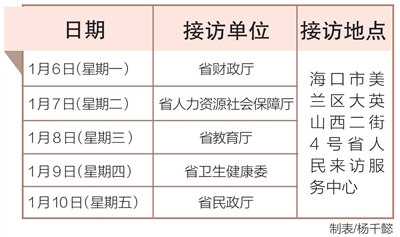 1月6日至1月10日,省财政厅、省人力资源社会保障厅、省教育厅、省卫生健康委、省民政厅相关负责人将在海口市美兰区大英山西二街4号省人民来访服务中心接访群众。