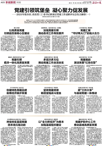 编者按:1月3日,2024年度市县、省直党(工)委书记抓基层党建工作述职评议会在海口召开。各市县党委和省委省直机关工委、省委非公有制经济组织和社会组织工委、省委金融工委、省委教育工委、省卫生健康委党委、省国资委党委等单位负责同志就2024年度抓基层党建工作情况进行述职。海南日报对述职报告予以摘登(按发言顺序)。