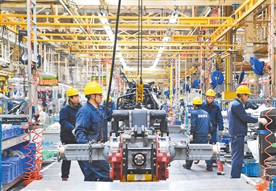 在河南洛阳,中国一拖集团有限公司员工在总装车间流水线上作业。新华社发