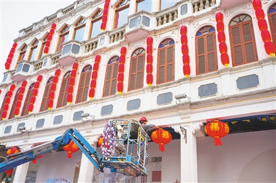 随着春节临近,海口骑楼老街烟火气十足,处处洋溢着喜庆的氛围。