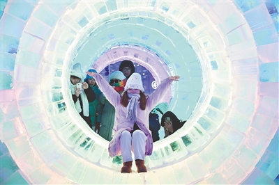 1月5日,游客在哈尔滨冰雪大世界园区游玩。