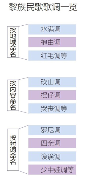 此外,黎族民歌歌调众多。在《黎族传统民歌三千首》中,有关专家共整理出了80余种黎族的歌调。