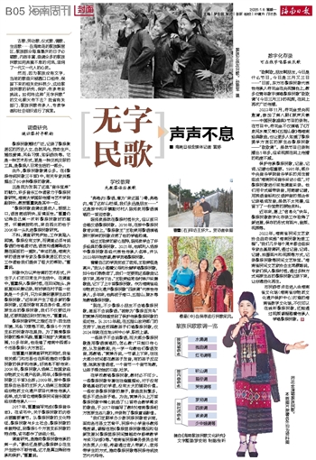 2022年,海南省民间文艺家协会启动实施“海南民歌抢救工程”。“我们几乎每个周末都会组织专家去基层调研,通过记音、记词、记谱、拍摄图片和视频等方式,记录黎族民歌等民间文艺珍宝。”海南省民间文艺家协会主席蔡葩说,专家们深入黎族村落,通过多种方式将原生态的黎族民歌记录下来,让非遗活化再生。