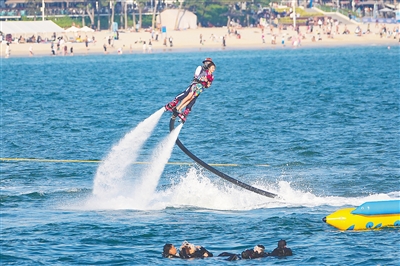 1月6日,在三亚大东海,众多游客前来体验水上游玩项目。随着春节即将来临,温暖阳光下的海南,桨板、冲浪、潜水、水上飞人、游艇等种类多样的水上游玩项目带给游客冬日里更丰富的游玩体验。