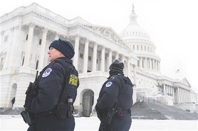 1月6日,在美国华盛顿,警察在美国国会大厦外站岗。新华社/法新