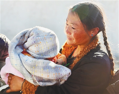 1月8日,定日县长所乡通来村的受灾群众措姆抱着自己的孩子在领取志愿者送来的御寒衣物。