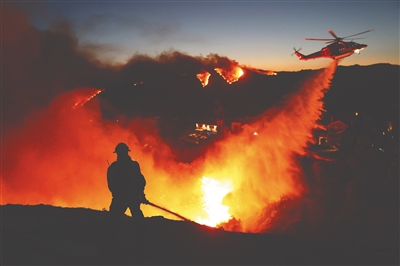 1月7日,在美国加利福尼亚州帕西菲克帕利塞兹,消防直升机和消防员参与扑灭山火。