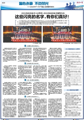 2024年是新中国成立75周年,也是海南自贸港封关运作的攻坚之年。这一年,琼州大地活力潮涌,海南自贸港建设蓬勃兴起、成型起势。这一年,有服务大局的铿锵步伐,有为民解忧的一腔赤诚,有打击犯罪的铁面无情,有栉风沐雨的藏蓝身影……为表彰先进、鼓舞士气、激励全警斗志,在第五个中国人民警察节来临之际,省公安厅向全社会宣传发布2024海南省最美人民警察、2024海南省最美辅警先进事迹。今天,让我们一起聆听他们扎根基层一线、守护万家灯火的动人故事。