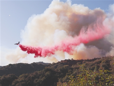 1月11日,一架消防飞机在美国加利福尼亚州洛杉矶曼德维尔峡谷的山丘上投放阻燃剂,以防止野火进一步蔓延。