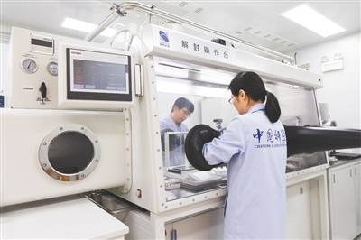 科研人员在月球样品实验室的解封操作台上处理嫦娥六号月球样品。新华社发