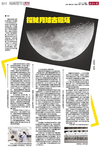 作为地球唯一的天然卫星, 月球具有与地球相近的年龄。自20世纪中叶人类开展探月活动开始,月球磁场研究一直是月球科学探测的重要内容。卫星观测和月表实测结果都显示现今月球没有全球偶极磁场,月壳却存在大规模的磁化。这表明月球可能也曾有过“发电机”磁场,或撞击磁场。