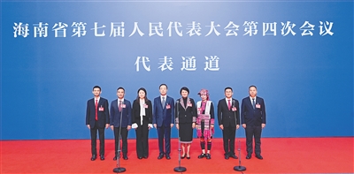 1月14日上午,海南省七届人大四次会议“代表通道”(第一场)活动结束后,代表集体亮相合影。 海南日报全媒体记者 封烁 摄