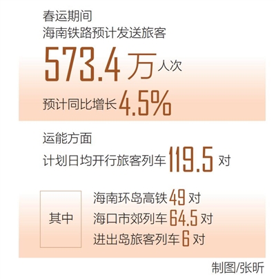 本报海口1月14日讯 (海南日报全媒体记者邵长春 通讯员黎成 杨晴)1月14日,除夕(1月28日)铁路车票开始发售。春运期间,海南铁路预计发送旅客573.4万人次,预计同比增长4.5%;运能方面,计划日均开行旅客列车119.5对,其中海南环岛高铁49对,海口市郊列车64.5对,进出岛旅客列车6对。为提升旅客出行美好体验,海南铁路在春运前对车站和动车组列车进行了全面客运服务提质。海南环岛高铁和乐、博鳌、凤凰机场、福山镇、尖峰、金月湾、银滩等车站建成使用综合服务台,实施进站检票、售票、改签、退票、到补、问询、旅服、出站等多岗合一,进一步为旅客提供全面集中的综合性服务,提升旅客出行体验。