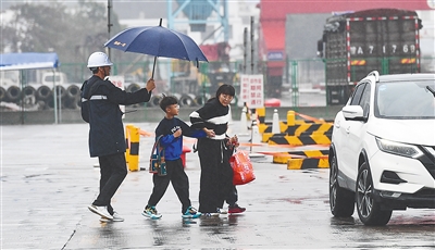 1月14日,海口市秀英港,工作人员为准备乘船的旅客打伞。新华社记者 杨冠宇 摄