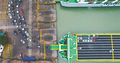 车辆在港区验票闸口处验票时,获得登船口信息,随后车辆依次通过安检、车客分离区,进入港口码头候船区排队登船。此时,距离开航仍有20分钟左右的时间。