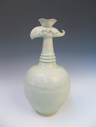 ■ 方波海南省博物馆所藏的一尊宋代青白釉花口凤首壶,口径约为6—7.3厘米,足径10.4厘米,高40厘米,壶身胎质洁白细腻,釉色莹润,白中泛青,类似青白玉般效果。壶口为四瓣花形,象征凤冠,颈部装饰呈凤首状,长颈渐宽,丰肩圆腹,凤首后部呈钩状,恰似一束长羽。
