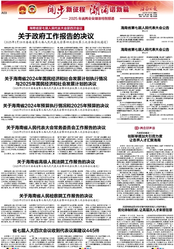 海南省第七届人民代表大会第四次会议审查了海南省人民政府提出的《关于海南省2024年国民经济和社会发展计划执行情况与2025年国民经济和社会发展计划草案的报告》及海南省2025年国民经济和社会发展计划草案,同意海南省人民代表大会财政经济委员会提出的审查结果报告。会议决定,批准《关于海南省2024年国民经济和社会发展计划执行情况与2025年国民经济和社会发展计划草案的报告》,批准海南省2025年国民经济和社会发展计划。