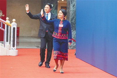 ⑤ 1月15日下午,省政协八届三次会议“委员通道”(第二场)活动。图为省政协委员邓颖颖(前)和莫青桥(后)向观众挥手。