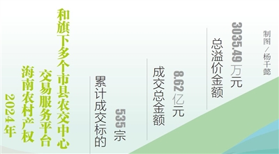 数据显示,2024年度,海南农村产权交易服务平台和旗下多个市县农交中心累计成交标的535宗,成交总金额8.62亿元,总溢价金额3035.49万元。