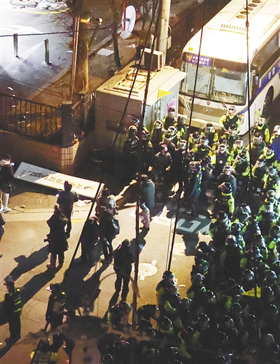 1月19日,韩国警察在首尔西部地方法院附近维持秩序。