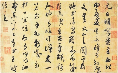 这封草书信札,纵25.2厘米,横40.5厘米,被后人称为《元日帖》。米芾一生,篆、隶、草、正皆有涉猎,行书成就最高,留下的行书作品也最多,而留下的草书作品则屈指可数。米芾的草书取法晋人,他曾在《论书帖》中说“草书若不入晋人格,辄徒成下品”。《元日帖》系米芾有感而写,用笔迅疾而力道沉雄,笔势跌宕起伏,线条对比强烈,意韵独特。此帖不仅体现了米芾高超的书写技艺,也体现了他对草书的独特理解。曹宝麟先生曾评价此帖:“涟水诸草,以此本最佳。”