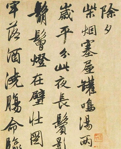 《除夕》的字体为行书。唐寅书法技艺精湛,他的行书效仿晋唐诸家,《圣教序》、李邕、欧阳询、赵孟頫等是其行书法度的重要来源。他的书法风格如其人般“潇潇洒洒,跌宕多姿”。《除夕》上的字,点画遒劲,骨力内含,结体欹侧取势,险绝而又圆转姿媚。作者循古法,也十分注重自我表达,这在古代是颇为难能可贵的地方。总体来说,唐寅个性鲜明的书风,是以他深谙古法和书法功力深厚为基础达到的。
