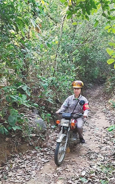 在管辖区巡护时,庞梅兰会在林地周围的石壁上写下警示标语,提醒人们这里禁止扩垦种植、侵占林地、采伐滥捕。大部分当地村民对她的工作十分支持,但偶尔也有人为了经济利益违规操作。有一次,庞梅兰发现有村民在山上违规扩种槟榔,破坏了原生植被,多次进行劝说。不料,没过几天,她的摩托车轮胎就被人扎破了,无奈之下,她只能推着重重的摩托车走了几公里山路回家。