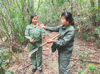 “除了休息日,我们每天要来回走十几公里,主要是看有没有人在山里搞破坏、打猎,有没有人扩垦。”庞梅兰介绍,每年3月到5月是森林火灾高风险期,他们还要走到森林外围的公路上观察有没有哪里冒烟,以此判断着火点的位置。