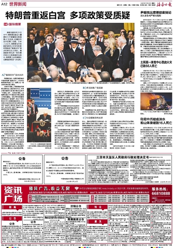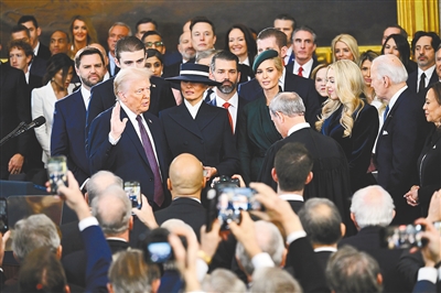 美国东部时间20日中午,特朗普在国会大厦圆形大厅宣誓就任美国第47任总统,时隔四年后开启第二任期。分析人士认为,特朗普当天的就职演讲以及发布的新政策具有“美国优先”特点和单边主义色彩。围绕就职典礼的一系列事件再次凸显美国政治极化,特朗普上台后美国社会撕裂恐将进一步加深。A