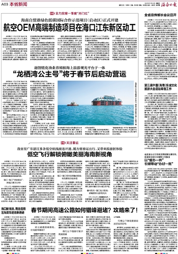 中国通航相关负责人表示,该公司积极探索“低空经济+旅游经济”等不同经济形态交融发展的新模式,大力拓展文旅消费新赛道、新业态和新场景,在为旅客提供跨琼州海峡通勤服务、提升琼粤两省运输往来便利度的同时,解锁俯瞰美丽海南、秀丽湛江的独特视角,为旅客提供独特的出行体验。下一步,将陆续推动开通多条跨海峡航线,方便广大旅客进出岛;结合自驾、住宿、景点空中体验等多场景模式,提供丰富多元的交通文旅产品。