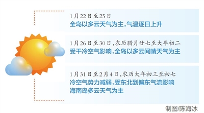 本报海口1月22日讯 (海南日报全媒体记者刘晓惠 通讯员李艺娜 实习生王子涵)1月22日,在海南省2025年新春旅游休闲宣传推广活动上,海南省气象台副台长董凌宇介绍,春节假期海南岛以多云间晴天气为主,阳光正好,体感温度舒适,适宜出游;海域风力适中,适合玩海踏浪。