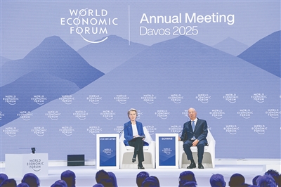 图为1月21日欧盟委员会主席冯德莱恩(左)与世界经济论坛创始人施瓦布参加世界经济论坛2025年年会。新华社发