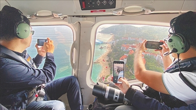三亚机场至海棠湾直升机航线乘客正在记录美景。