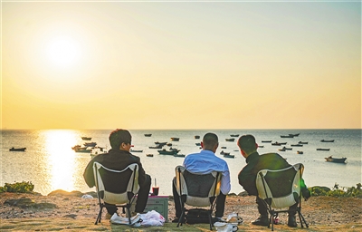 ② 近日,在儋州市峨蔓镇火山海岸地质公园,游客在欣赏落日美景。