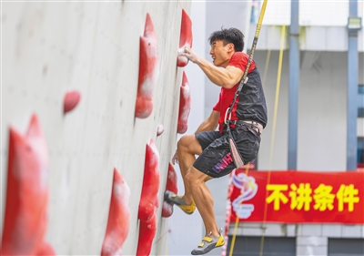 近日,在国家体育训练南方基地(海南白沙·综合),攀岩运动员龙金宝身姿矫健。