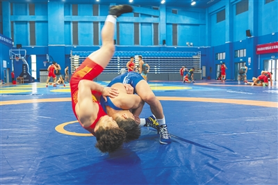 近日,在国家体育训练南方基地(海南白沙·综合),国家摔跤队队员激烈对抗。