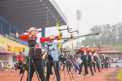 近日,中国国家射箭队运动员李佳蔓(左一)在国家体育训练南方基地(海南白沙·综合)拉弓射箭。