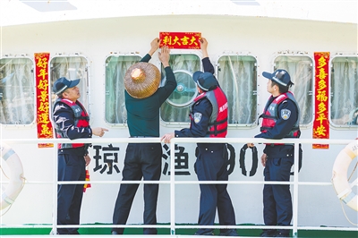 1月21日,琼海市公安局潭门海岸派出所组织民辅警进港口,上渔船,开展“送祝福,话安全”活动,向停靠潭门渔港的渔船民送上春联等新年祝福,并与渔船民一起贴春联,唠家常,话安全。