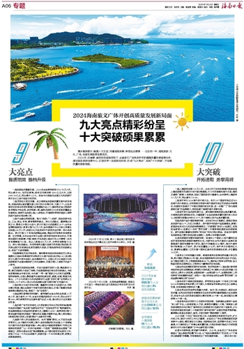 漫步碧浪银沙,触摸人文古迹,传播海南故事,挥洒运动激情……过去的一年,海南旅游、文化、广电、体育发展取得显著成效。2024年,在省委、省政府的坚强领导下,全省旅文广体系统牢牢把握高质量发展首要任务,建设国际旅游消费中心,打造世界一流旅游目的地,形成“九大亮点”,实现“十大突破”,开创高质量发展新局面。