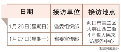 1月26日至27日,省委组织部、省委宣传部相关负责人将在海口市美兰区大英山西二街4号省人民来访服务中心接访群众。