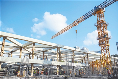 1月25日,在三亚市中国海南国际文物艺术品交易中心和海南国际文化交流中心项目建设现场,工人加紧施工,保障工程有序推进。据介绍,该项目是省重点项目,计划今年内实现主体结构封顶,2026年完成竣备,建成后将打造成海南自贸港滨海会客厅。