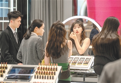 ② 1月24日,消费者在cdf海口国际免税城试用化妆品。